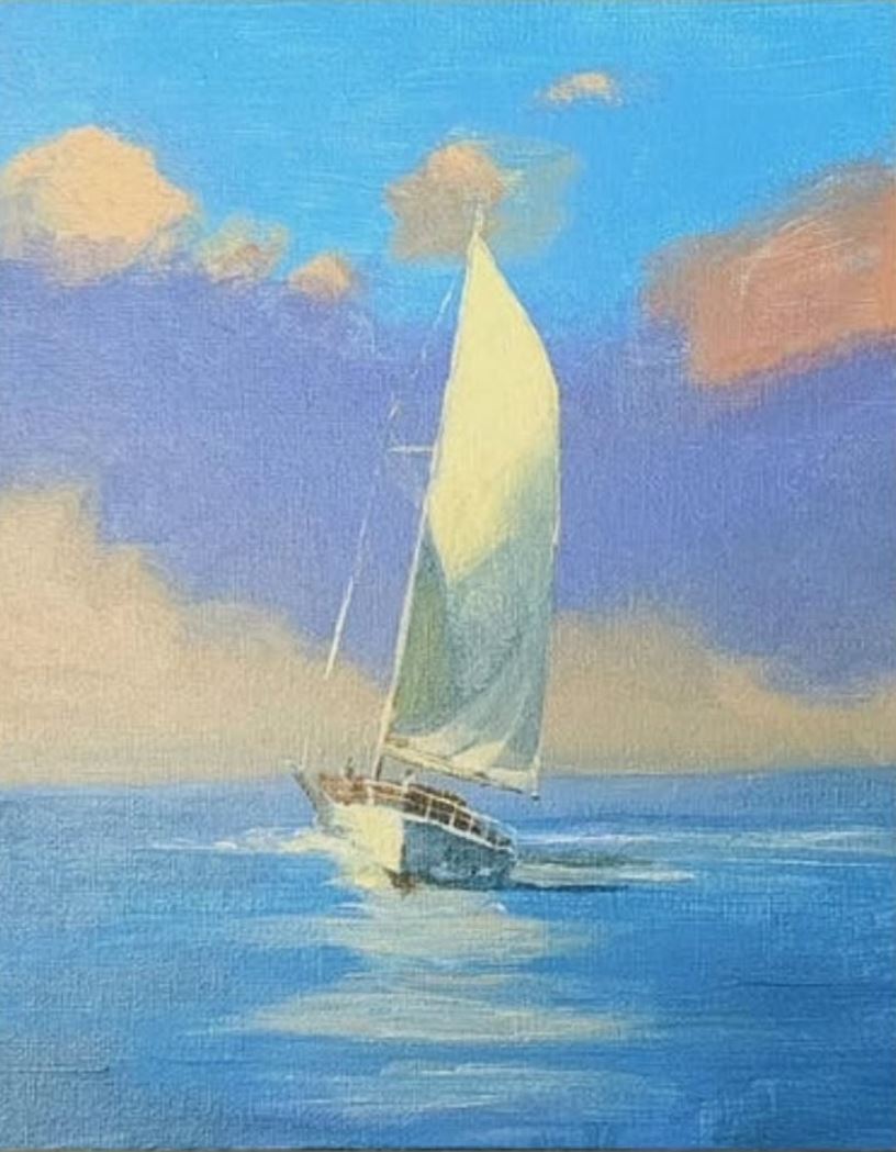 This painting captures a moment of freedom and elegance as a lone sailboat glides across calm coastal waters beneath a beautiful sky. Painted in acrylic on panel, this original 8x10 artwork invites the viewer to feel the gentle motion of the sea and the exhilaration of catching the wind. Hints of peach and lavender clouds frame a sail catching the sunlight, creating a dreamy, timeless atmosphere.