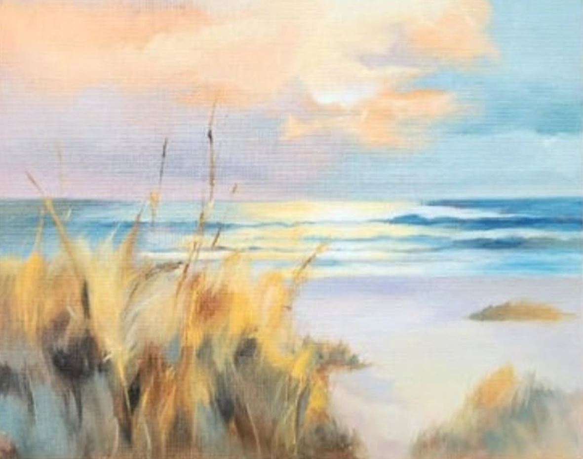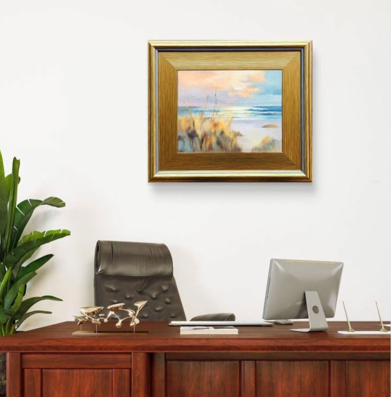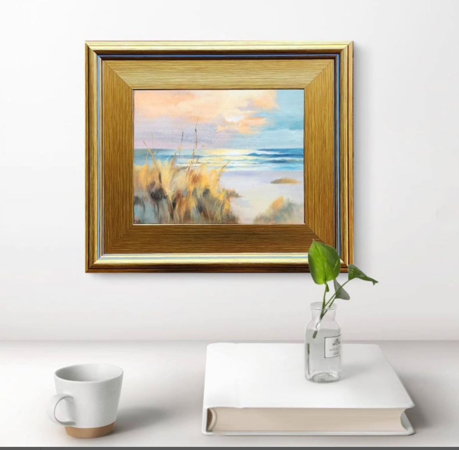 Whispers of the Shore captures a tranquil coastal moment where golden dune grasses sway gently in the breeze, leading the eye toward soft waves and a glowing horizon. This original 8x10 oil painting on panel evokes a sense of calm and gentle nostalgia, with a delicate palette of peach, blue, and sandy neutrals.